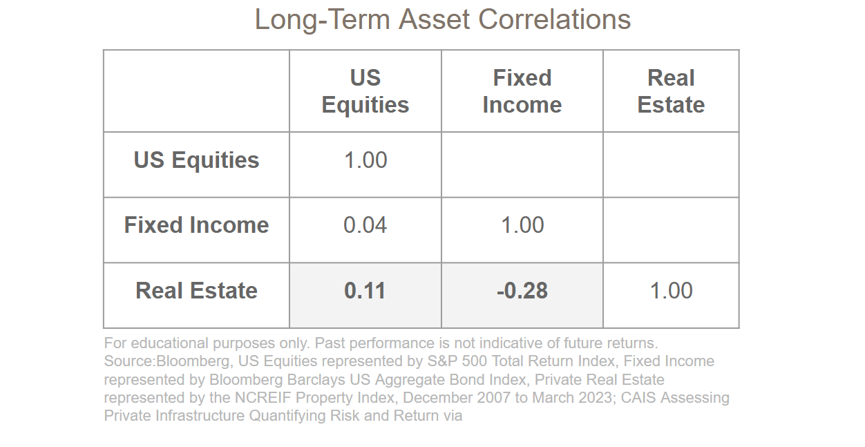 Private real estate has historically shown low correlation to both public equities and fixed income. According to an analysis from CAIS, private real estate returns have had a correlation of approximately 0.11 to the S&P 500 and -0.28 to the Bloomberg Aggregate Bond Index over a recent 15-year period.